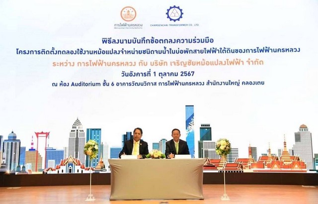 นายประจักษ์ กิตติรัตนวิวัฒน์ รองกรรมการผู้จัดการ บริษัท เจริญชัยหม้อแปลงไฟฟ้า จำกัด ต้อนรับคณะผู้บริหารการไฟฟ้านครหลวง (งานระบบสายไฟฟ้าใต้ดิน) ที่ให้เกียรติเยี่ยมชมหม้อแปลง ใต้น้ำโลว์คาร์บอน (Submersible Transformer Low Carbon) เทคโนโลยีชั้นนำ ผลิตภัณฑ์รางวัลนวัตกรรมแห่งชาติอันดับ 1 ( NiA )“ ด้านประหยัดพลังงาน อนุรักษ์พลังงาน เสริมสร้างความมั่งคง ระบบไฟฟ้า เทคโนโลยีแบบ IoT ”