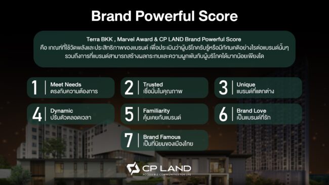 สำหรับรางวัลในครั้งนี้มาจากผลการวิจัย Real Estate The Most Powerful Brand 2024 โดย TERRA BKK การสำรวจนี้มี ค่า Confidence Interval 95% และ Standard Error 0.05 โดย CP LAND ได้รับคะแนนสูงสุดในทั้ง 7 ด้าน 1.ตรงกับความต้องการ 2.เชื่อมั่นในคุณภาพ 3.แบรนด์ที่เเตกต่าง 4.ปรับตัวตลอดเวลา 5.คุ้นเคยกับเเบรนด์ 6.เป็นแบรนด์ที่รัก 7.เป็นที่นิยมของเมืองไทย ด้วยคะแนนรวม 54% ซึ่งสูงกว่าค่าเฉลี่ย 42% อย่างชัดเจน รางวัลนี้สะท้อนถึงความไว้วางใจที่ผู้บริโภคมีต่อแบรนด์ พร้อมตอกย้ำถึงความสำเร็จของ CP LAND ในการเป็นแบรนด์อสังหาริมทรัพย์ที่มุ่งมั่นพัฒนาคุณภาพและสร้างคุณค่าเพื่อทุกชีวิตอย่างแท้จริง