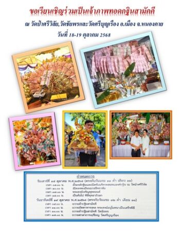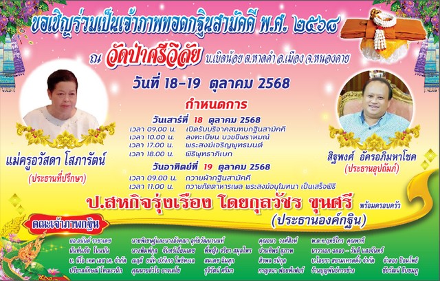 โดยคุณกุลวัชร ขุนศรี พร้อมครอบครัว (ป.สหกิจรุ่งเรือง) และประธานที่ปรึกษา แม่ครูอวัสดา โสภารัตน์ พร้อมด้วย เจ้าภาพใหญ่งานกฐิน คุณสิฐพงศ์ อัครอภิมหาโชค ตลอดกัลยาณมิตรได้ร่วมใจในงานทอดกฐินครั้งสำคัญนี้ด้วย โดยเริ่มงานตั้งแต่วันที่ 18-19 ตุลาคม 2568 รวมการทอดกฐินครั้งนี้ 3 วัด ที่จังหวัดหนองคาย คือ วัดป่าศรีวิลัย,วัดชัยพร และวัดศรีบญเรือง ณ โอกาสนี้ จึงขอเชิญชวนสาธุชนที่มีจิตศรัทธา ร่วมบริจาคสมทบทุนได้ที่บัญชีวัดป่าศรีวิลัย รหัสสาขา 413 ธนาคารกรุงไทย เลขที่ 413-0-43742-9 สาขาหนองคาย สนับสนุนเผยแพร่ข่าวทางเว็บไซต์ โดยบรรณาธิการข่าว น.ส.พ.โฟกัสไทม์และทีมงาน พร้อมเผยแพร่ข่าวทางสถานีโทรทัศน์ช่อง 5 “รายการเปิดฟ้า”